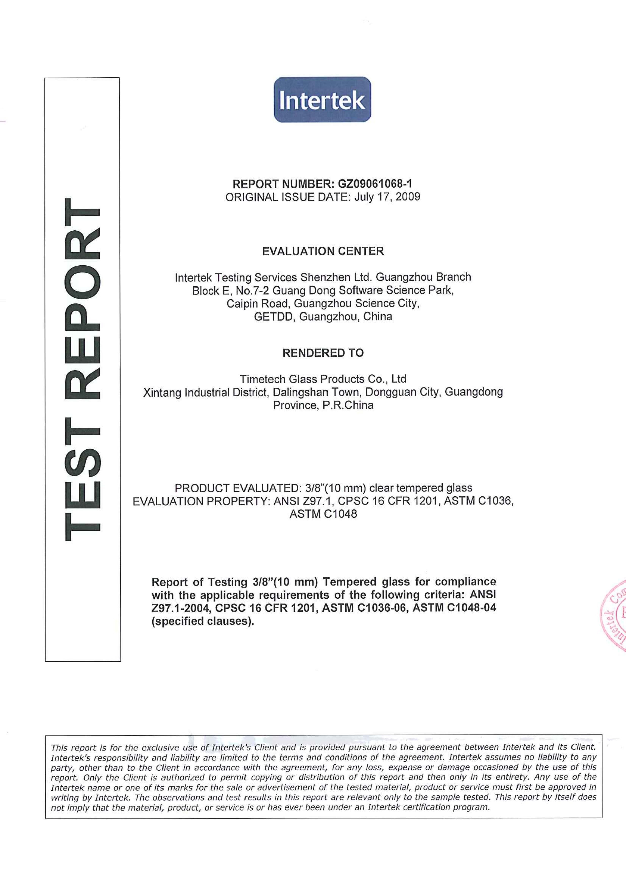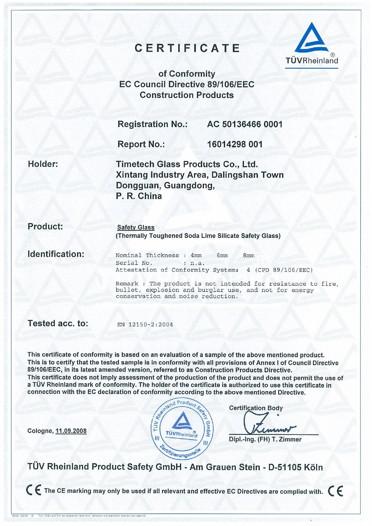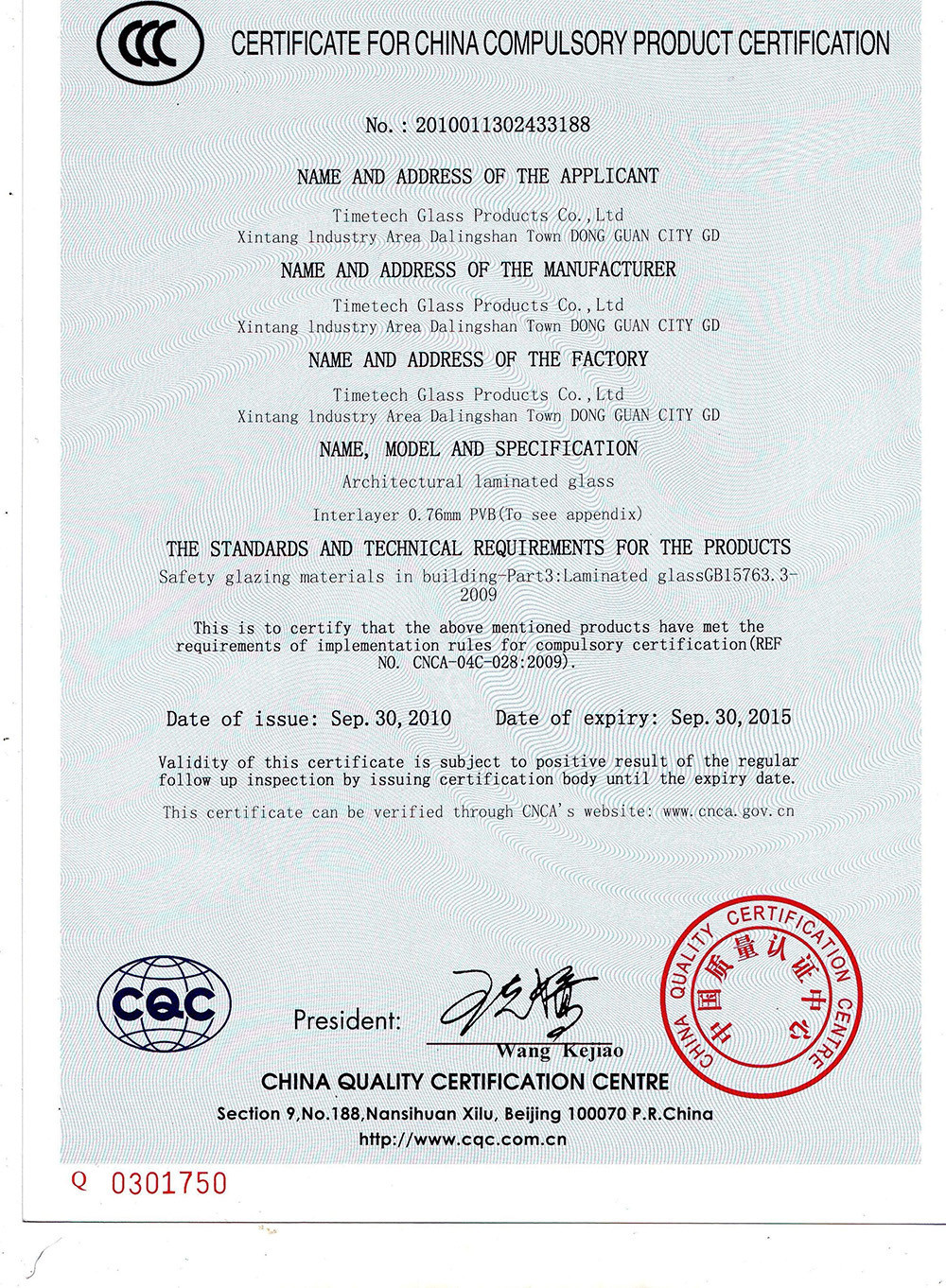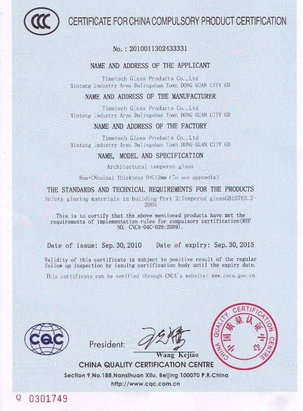 Timetech Glass strictly adheres to the ISO9001:2000 and Chinese Safety Glass Compulsory Certification(CCC) standards. We pass standard of U.K BS6206, CE EN12150, ANSI Z97.1-2009, AS/NZS2208 and own the certificates.