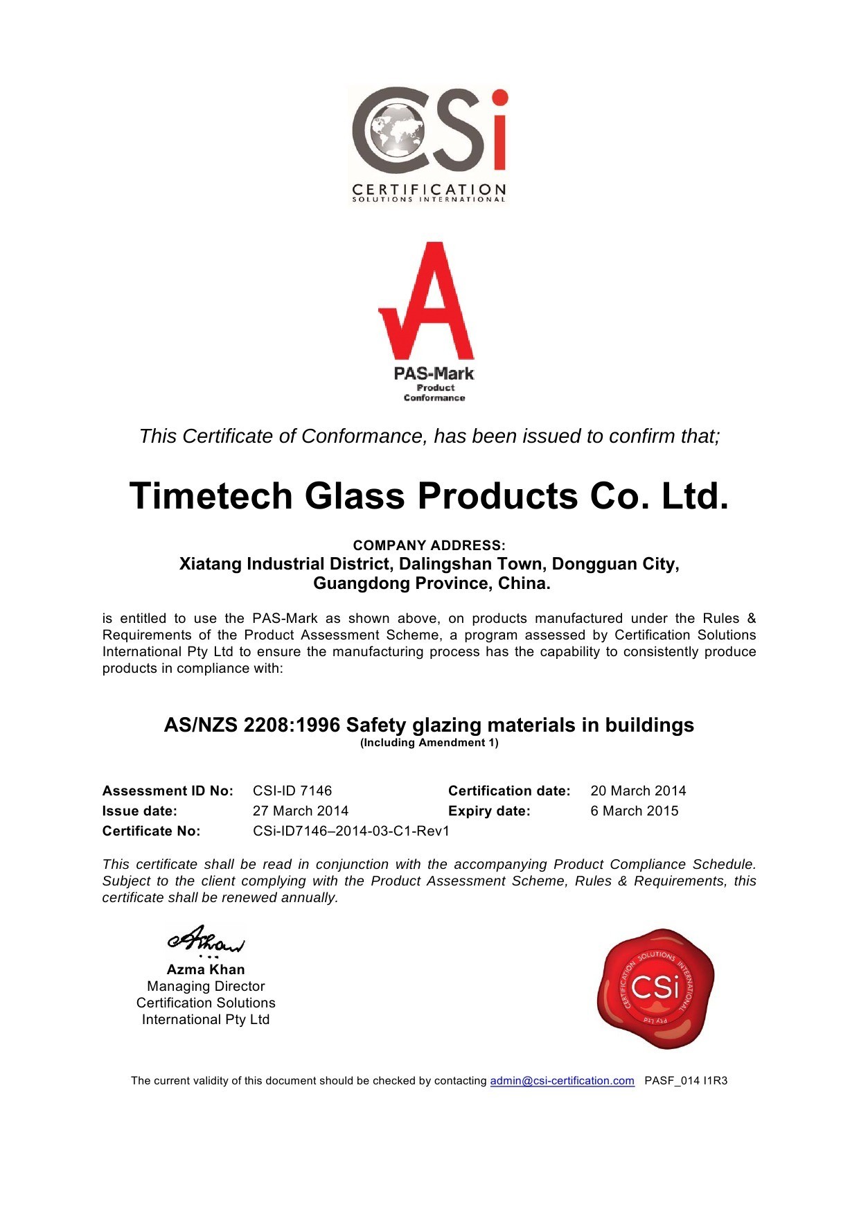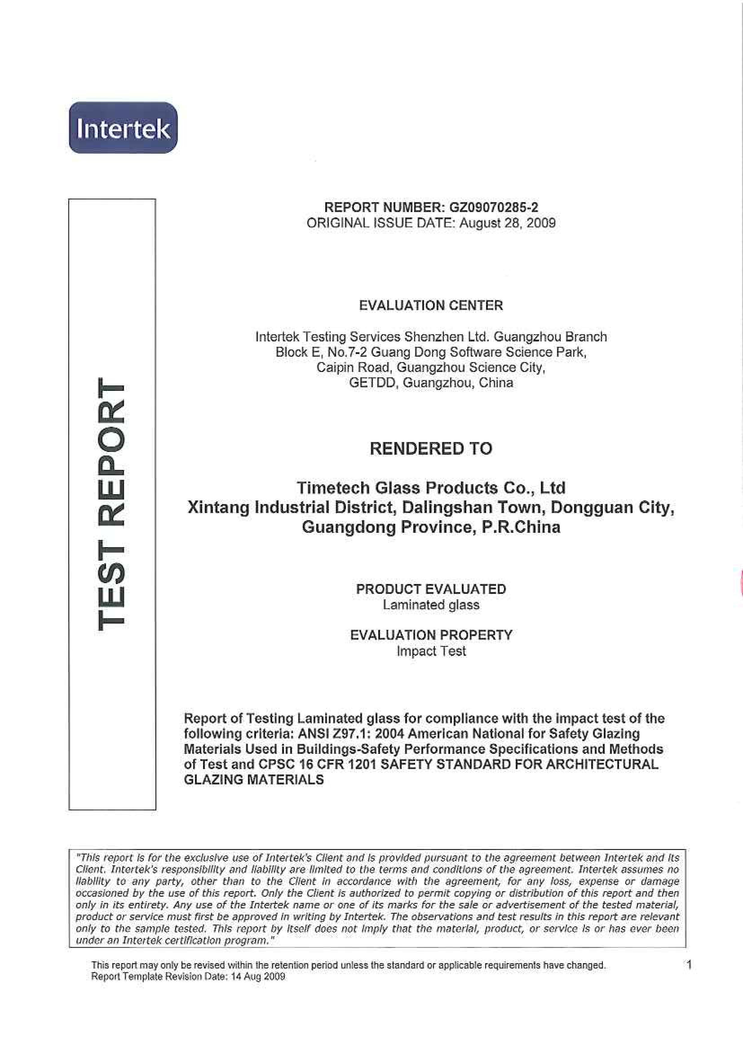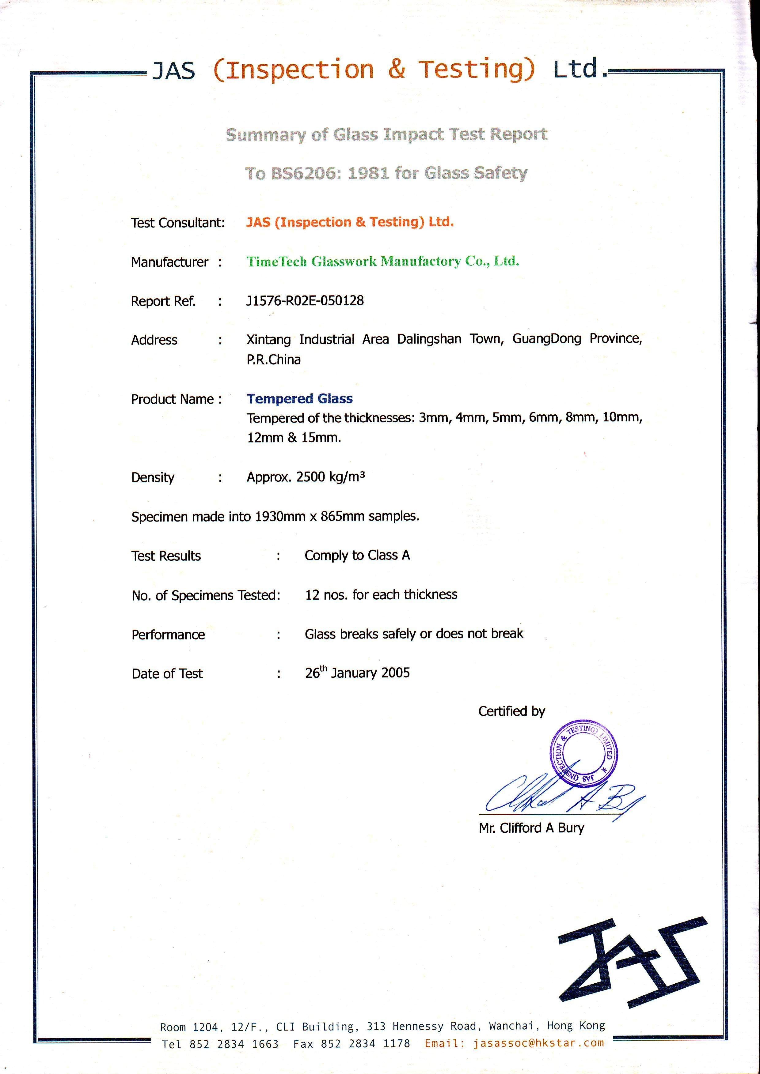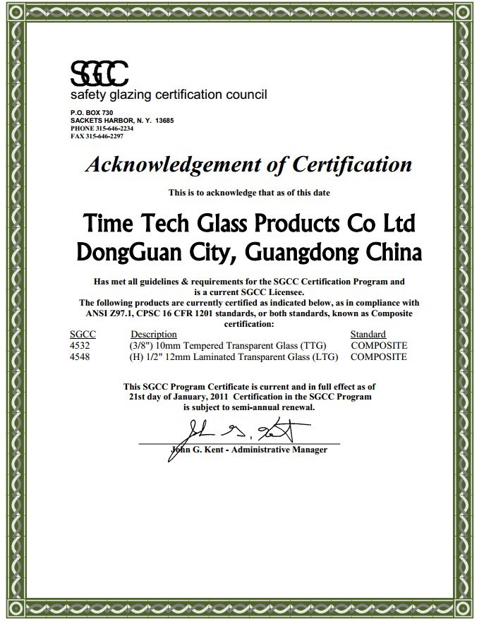 Timetech Glass strictly adheres to the ISO9001:2000 and Chinese Safety Glass Compulsory Certification(CCC) standards. We pass standard of U.K BS6206, CE EN12150, ANSI Z97.1-2009, AS/NZS2208 and own the certificates.